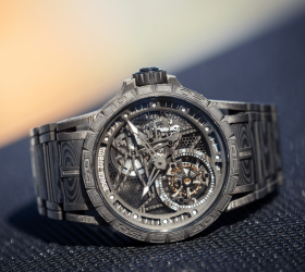 一款搭配小牛皮表带的Excalibur Automatic Skeleton镂空自动上链玫瑰金腕表,一款Excalibur Automatic Skeleton镂空自动上链黑色DLC涂层钛金属腕表,以及一款搭配橡胶表带的Excalibur Skeleton Flying Tourbillon Carbon SMC镂空飞行陀飞轮碳纤维腕表。