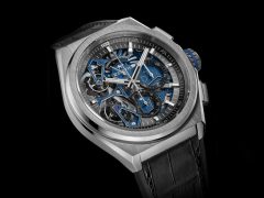面盘上宽大的时针和分针扫过机械结构,而细长中置小秒针顶端则採用星形装饰,配备秒针停走系统,可实现超精确校准,精确到秒。 标志性的Defy Inventor採用蓝色鱷鱼皮内衬黑色橡胶表带,贴合在手腕上,具有极致的未来主义风格。