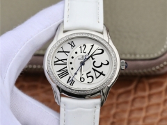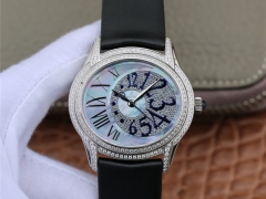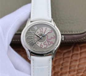表盘材质银色表盘搭配白色珍珠贝母偏心圆盘、玫瑰金指针、钻石立体时标、玫瑰金质立体阿拉伯数字和立体罗马数字。
