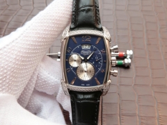 搭载机芯进口7750机械机芯,3位小秒盘,6位9位计时盘,意大利精致小牛皮表带搭配原装折迭扣,进口蓝宝石水晶玻璃防损镜面,独特的勾玉状表耳设计,单向旋转圈,尺寸42mm。